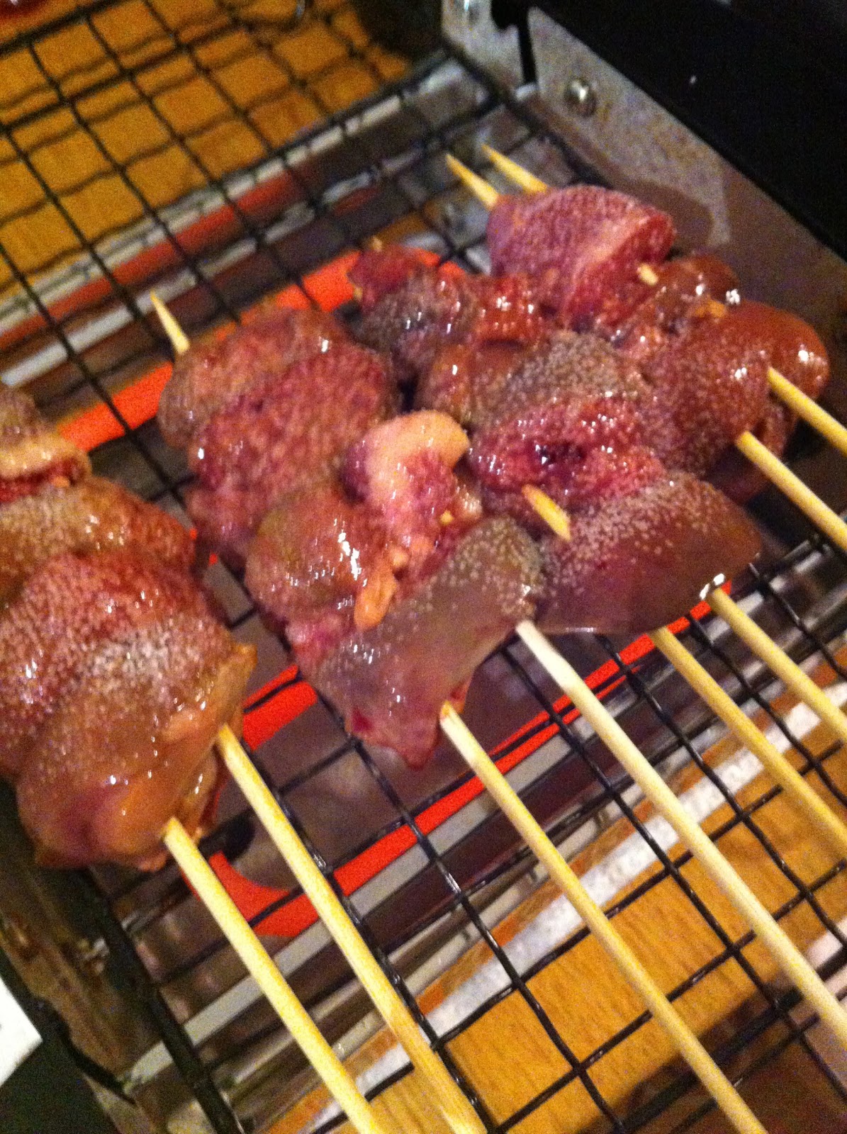 精肉屋で大好きなー鳥レバーと300g程買い、切って串にさす。塩をふり、乗せる。いざスイッチオン。